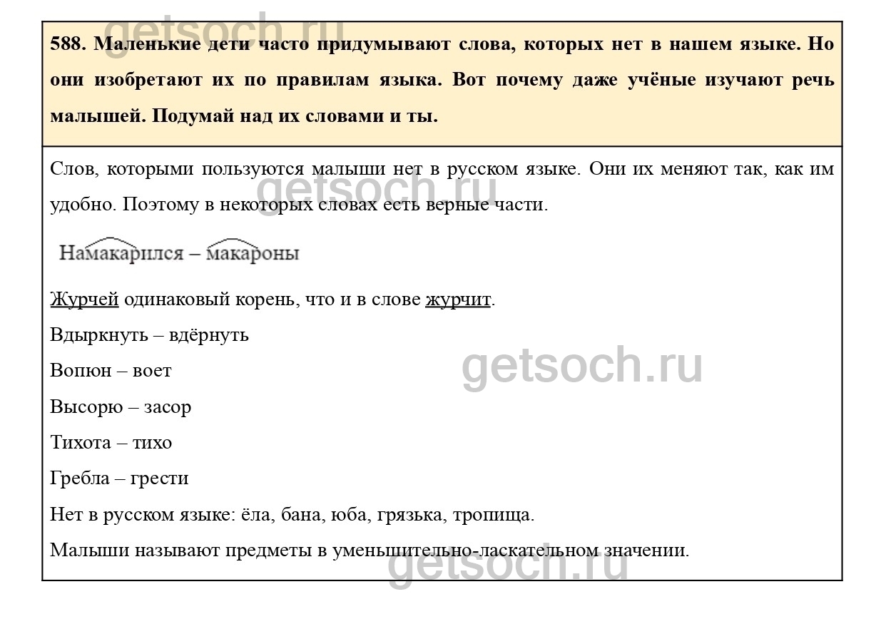 588. Маленькие дети часто придумывают слова, которых нет в нашем языке. Но они изобретают их по правилам языка. Вот почему даже учёные изучают речь малышей. Подумай над их словами и ты.