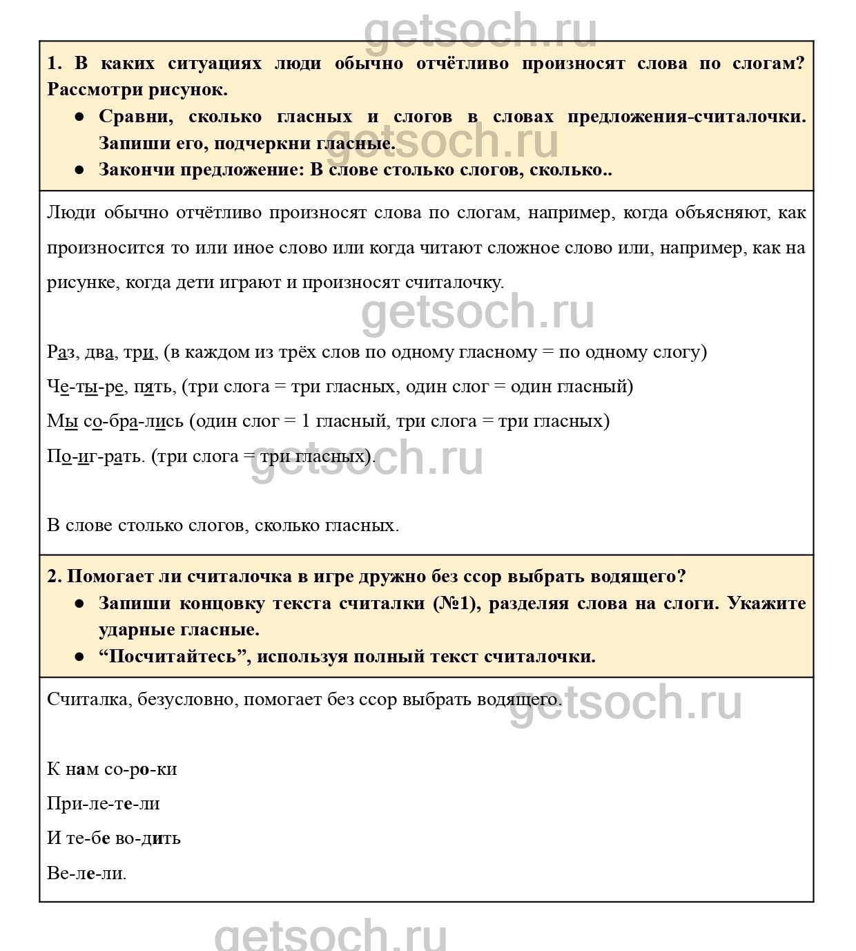 Сравни, сколько гласных и слогов в словах предложения-считалочки. Запиши его, подчеркни гласные.