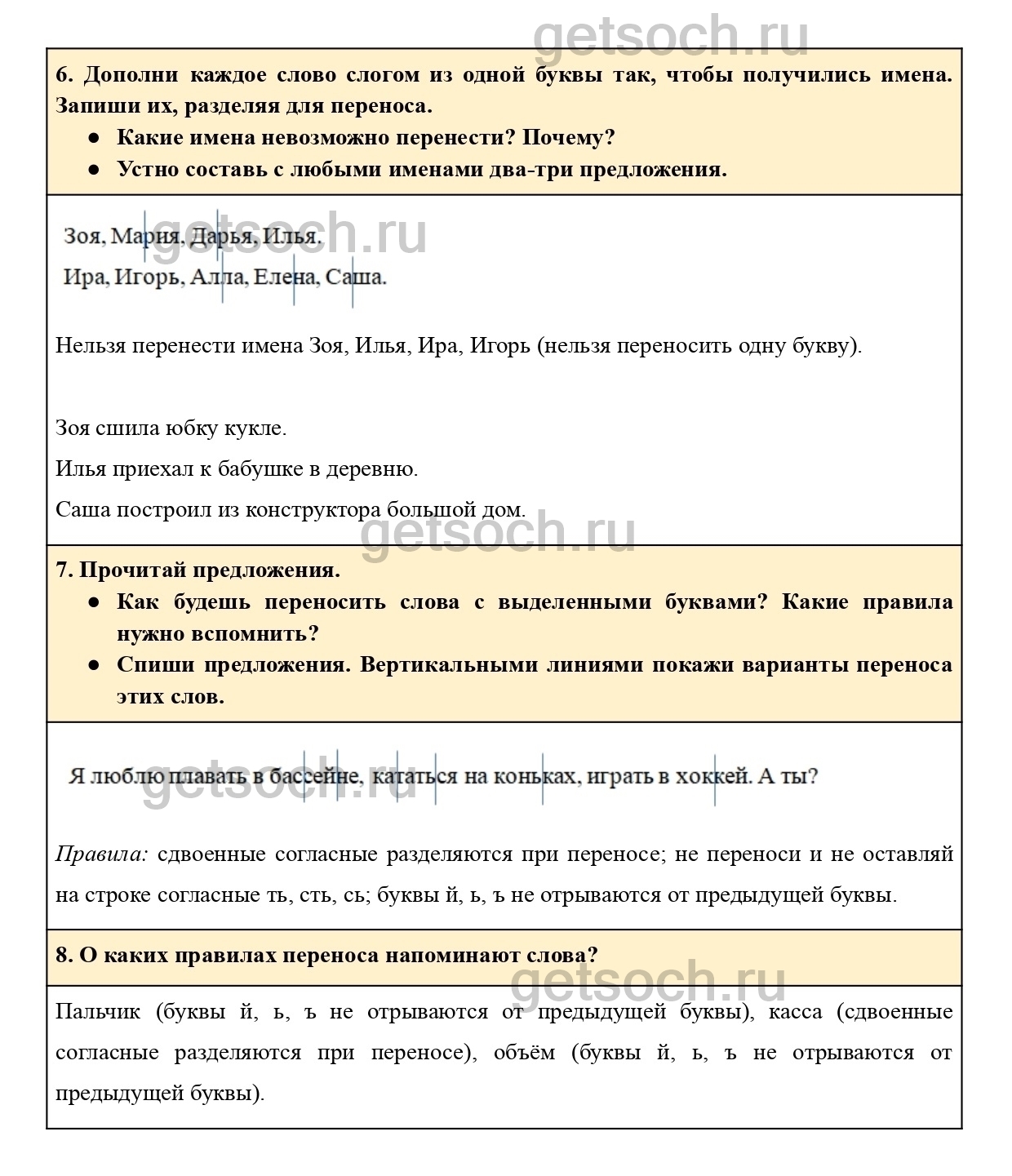 Спиши предложения. Вертикальными линиями покажи варианты переноса этих слов.”