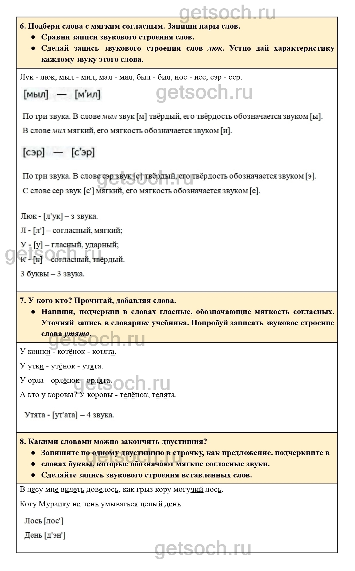 Напиши, подчеркни в словах гласные, обозначающие мягкость согласных. Уточняй запись в словарике учебника. Попробуй записать звуковое строение слова утята.”