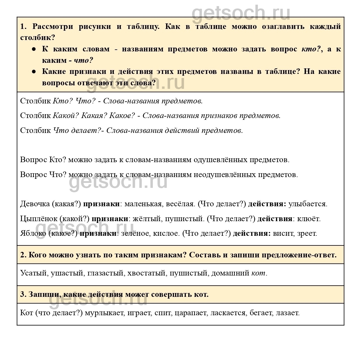 Какие признаки и действия этих предметов названы в таблице? На какие вопросы отвечают эти слова?”