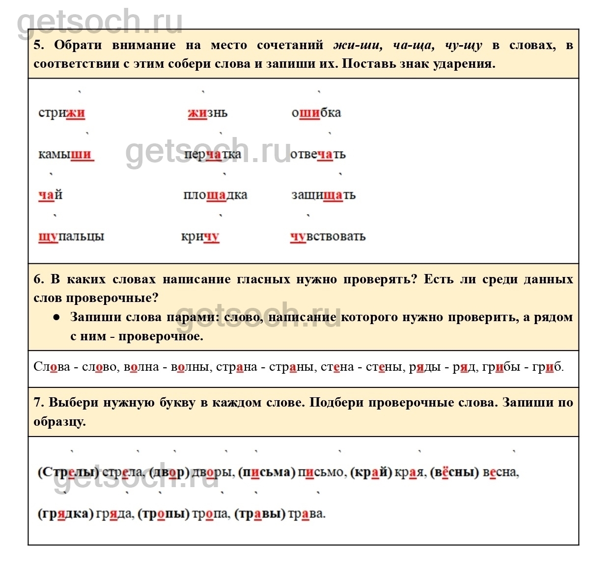 5. Обрати внимание на место сочетаний жи-ши, ча-ща, чу-щу в словах, в соответствии с этим собери слова и запиши их. Поставь знак ударения.
