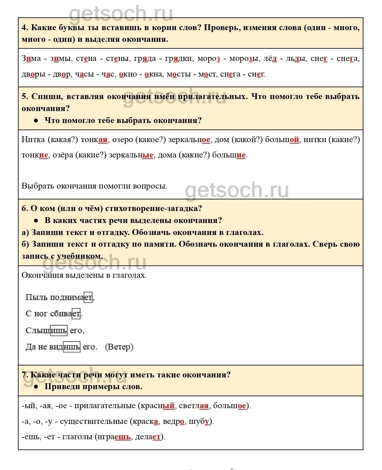 4. Какие буквы ты вставишь в корни слов? Проверь, изменяя слова (один – много, много – один) и выделяя окончания.