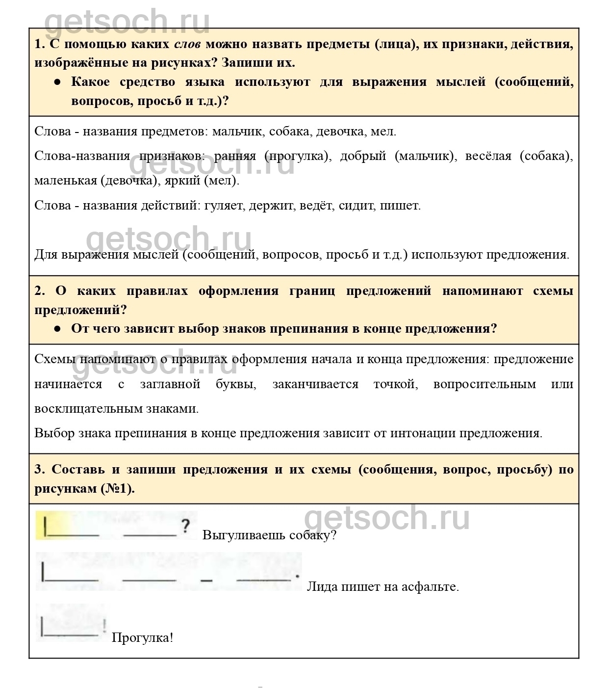 3. Составь и запиши предложения и их схемы (сообщения, вопрос, просьбу) по рисункам (№1).