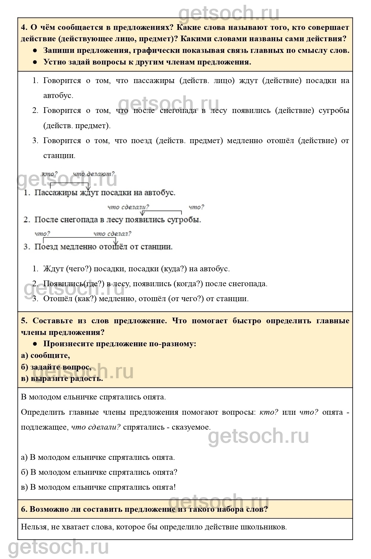 “4. О чём сообщается в предложениях? Какие слова называют того, кто совершает действие (действующее лицо, предмет)? Какими словами названы сами действия?