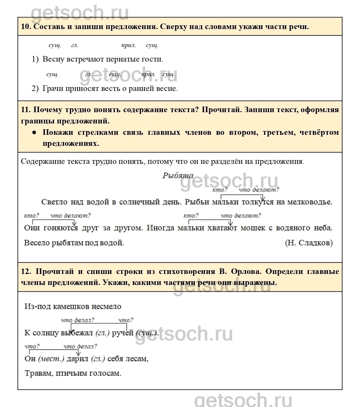 12. Прочитай и спиши строки из стихотворения В. Орлова. Определи главные члены предложений. Укажи, какими частями речи они выражены.