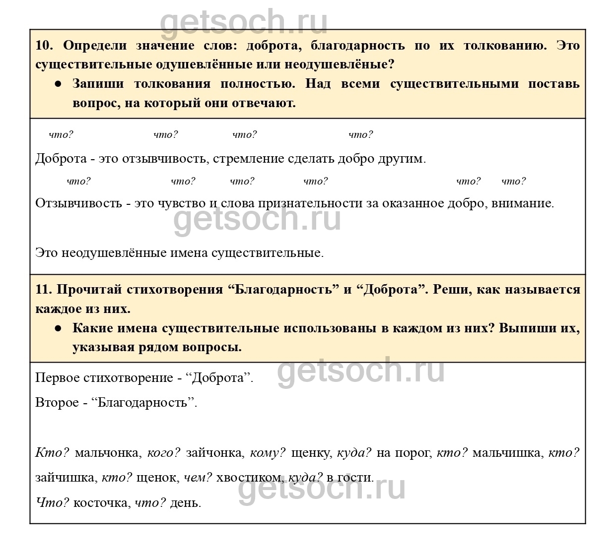 “10. Определи значение слов: доброта, благодарность по их толкованию. Это существительные одушевлённые или неодушевлёные?