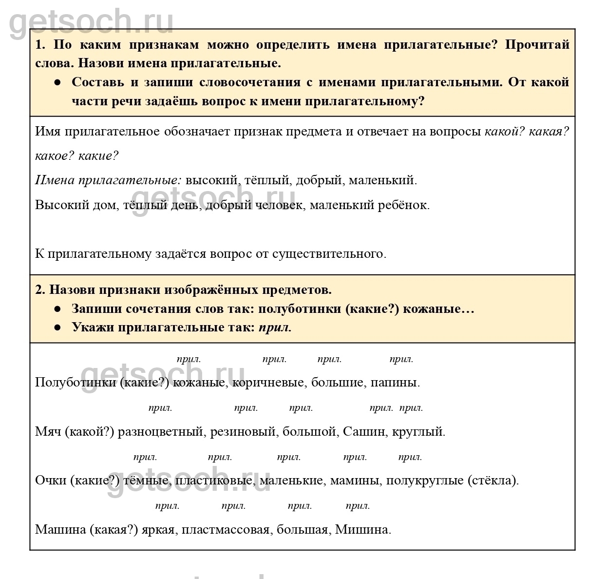 “1. По каким признакам можно определить имена прилагательные? Прочитай слова. Назови имена прилагательные.