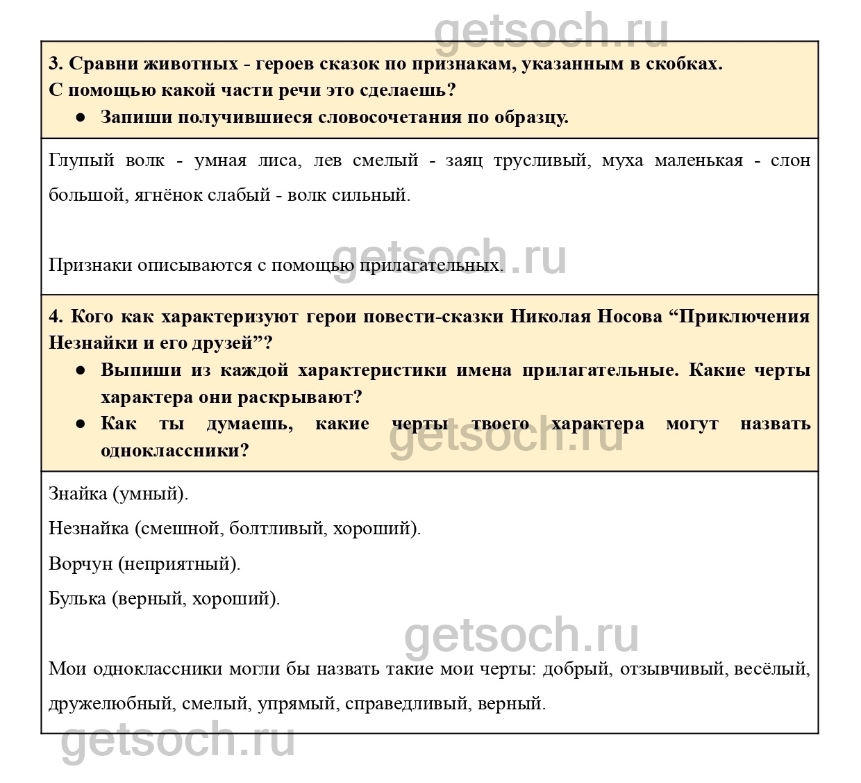 “3. Сравни животных – героев сказок по признакам, указанным в скобках.