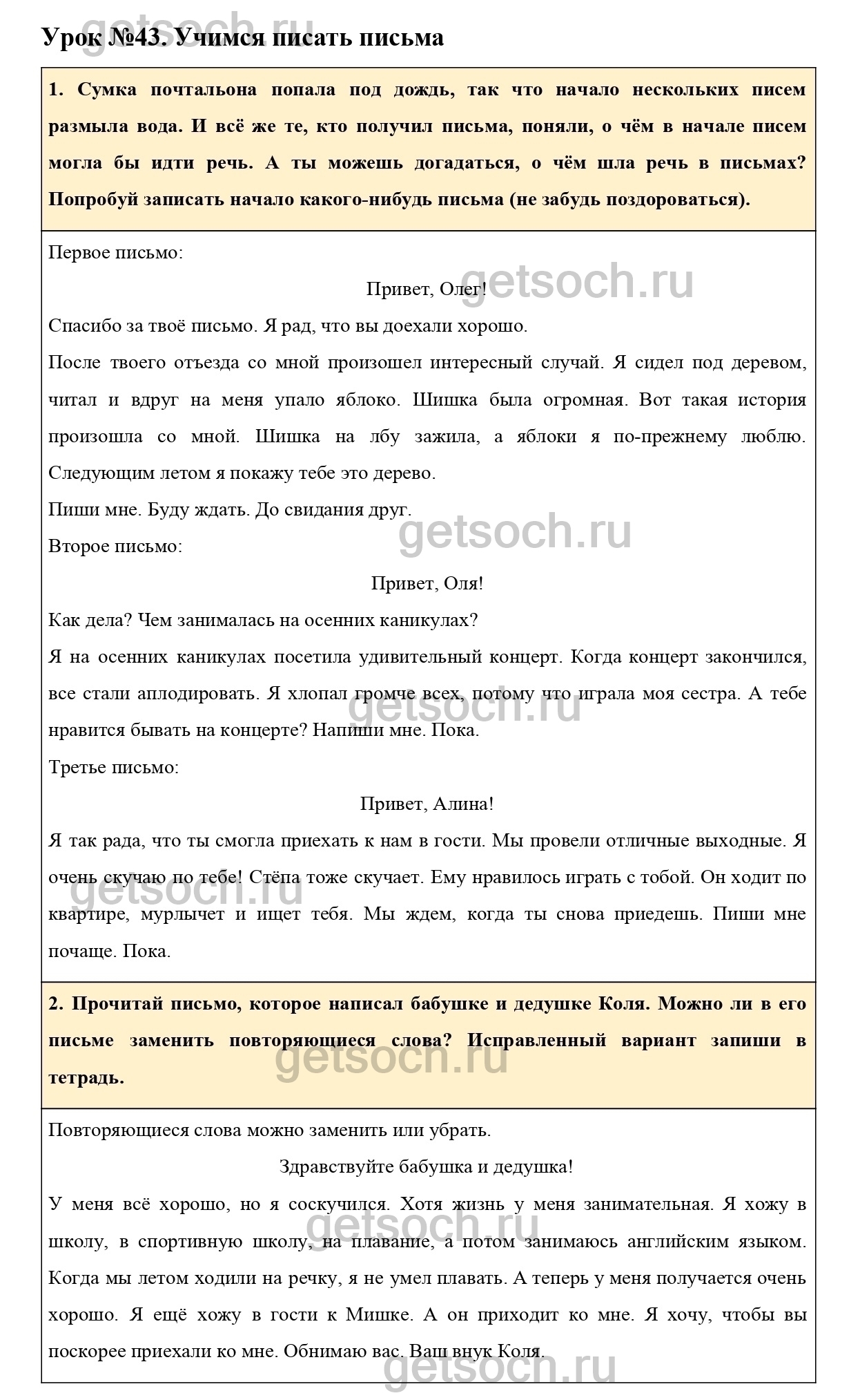 2. Прочитай письмо, которое написал бабушке и дедушке Коля. Можно ли в его письме заменить повторяющиеся слова? Исправленный вариант запиши в тетрадь.