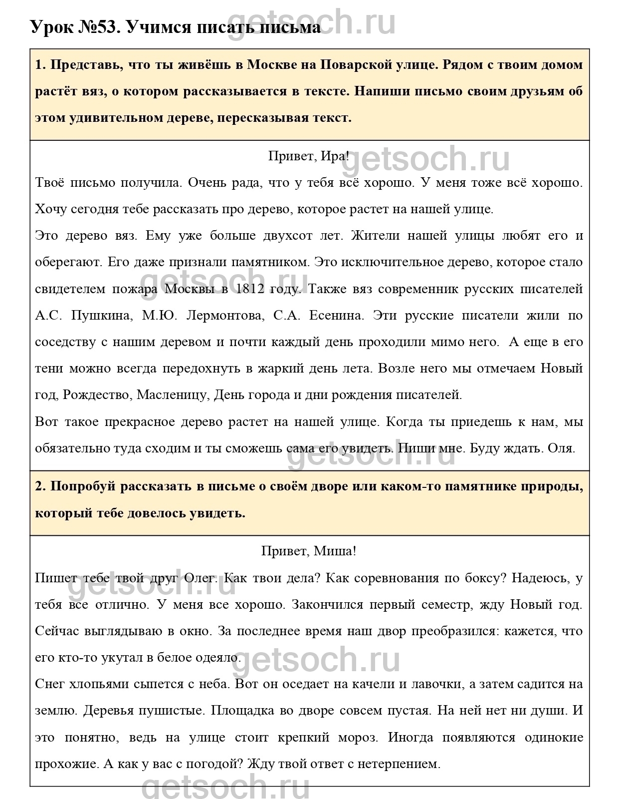 1. Представь, что ты живёшь в Москве на Поварской улице. Рядом с твоим домом растёт вяз, о котором рассказывается в тексте. Напиши письмо своим друзьям об этом удивительном дереве, пересказывая текст.