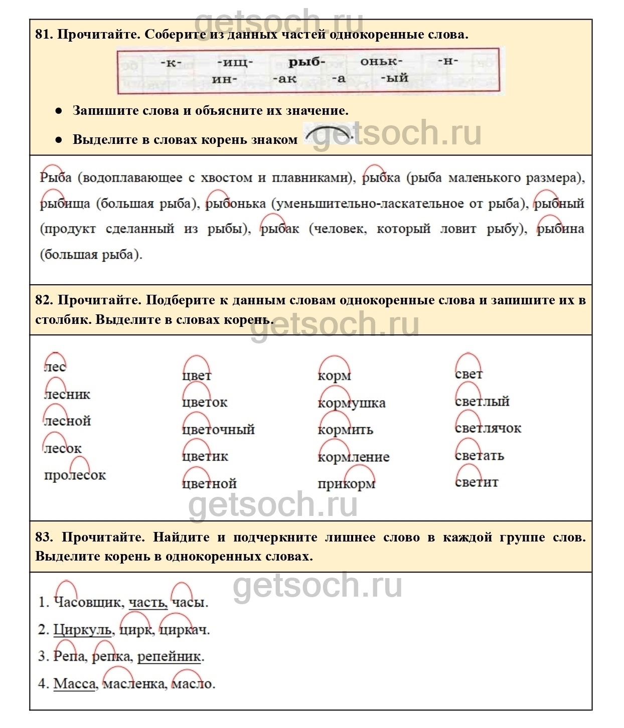 83. Прочитайте. Найдите и подчеркните лишнее слово в каждой группе слов. Выделите корень в однокоренных словах.