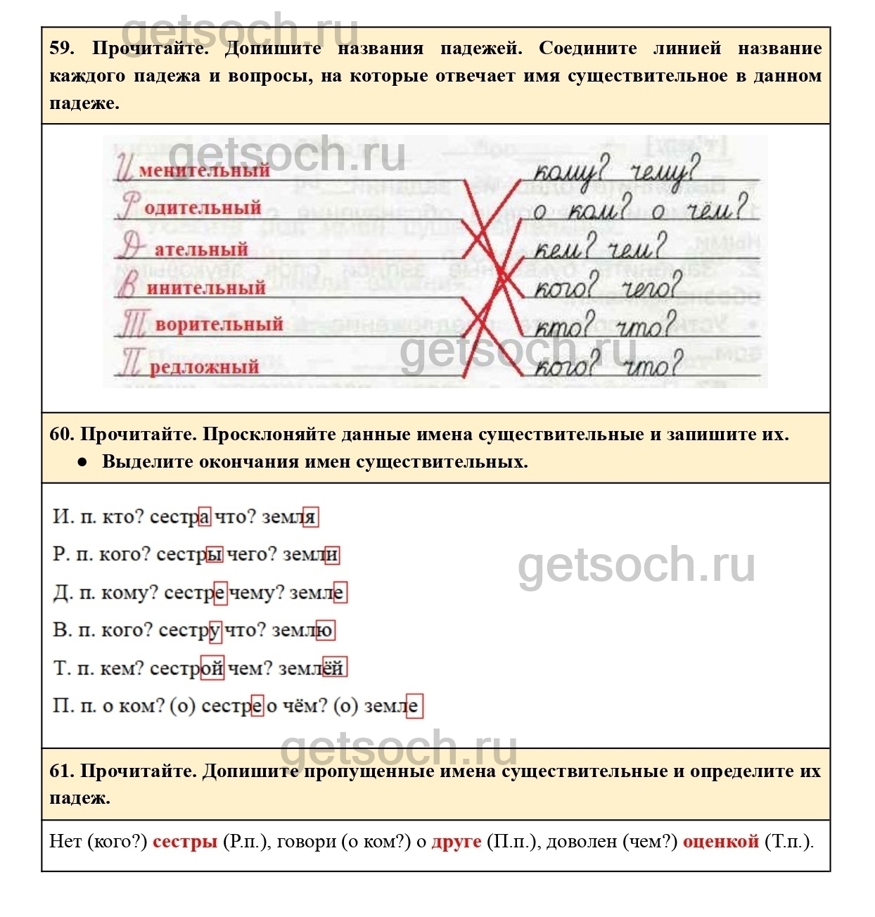 59. Прочитайте. Допишите названия падежей. Соедините линией название каждого падежа и вопросы, на которые отвечает имя существительное в данном падеже.