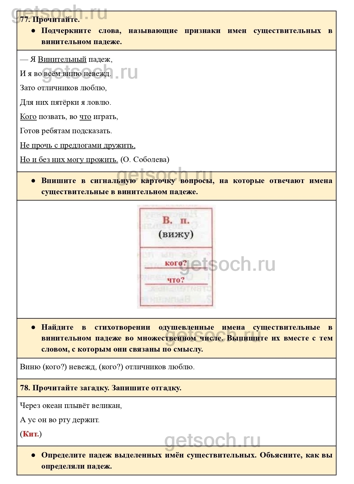 Впишите в сигнальную карточку вопросы, на которые отвечают имена существительные в винительном падеже.