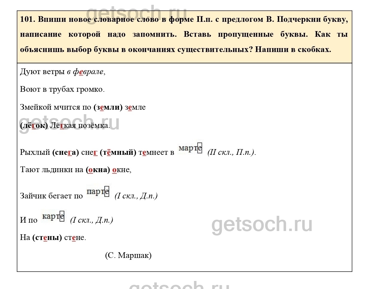 Рассмотрим ответы на Упражнение 101 из тетради для самостоятельной работы по русскому языку для 3 класса Байковой