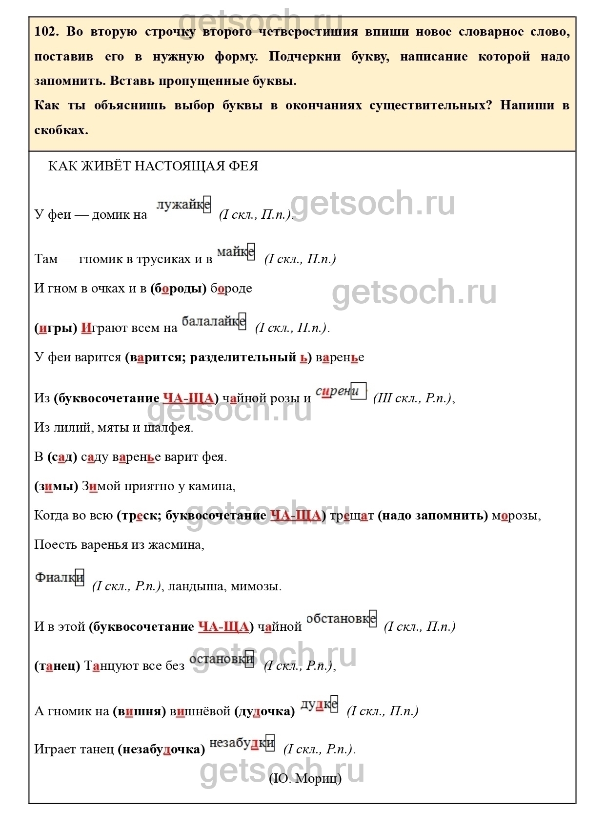 102. Во вторую строчку второго четверостишия впиши новое словарное слово, поставив его в нужную форму. Подчеркни букву, написание которой надо запомнить. Вставь пропущенные буквы.