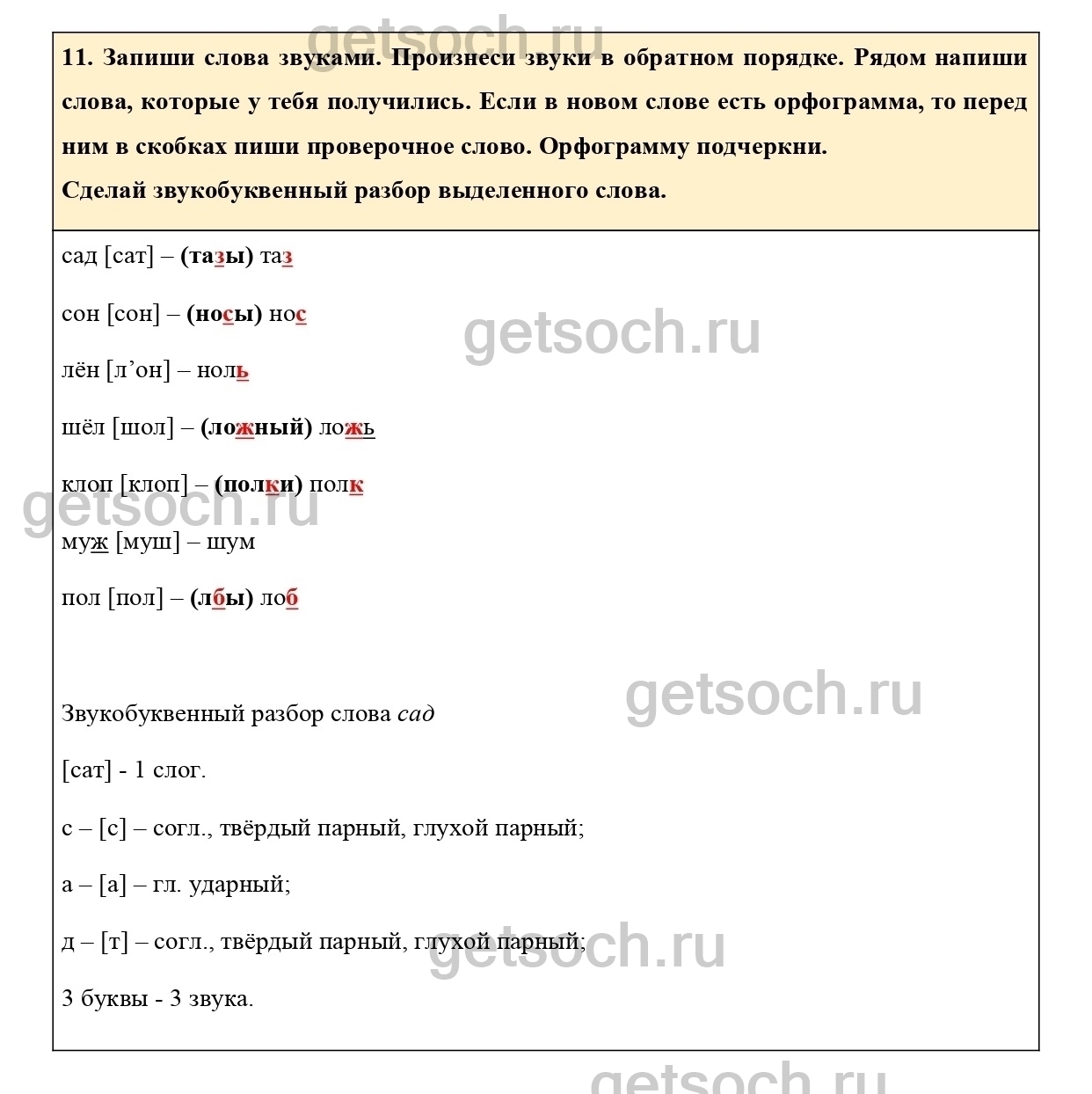 11. Запиши слова звуками. Произнеси звуки в обратном порядке. Рядом напиши слова, которые у тебя получились. Если в новом слове есть орфограмма, то перед ним в скобках пиши проверочное слово. Орфограмму подчеркни.