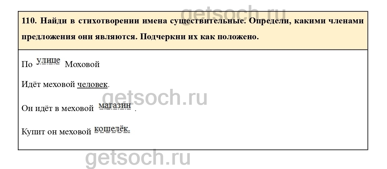 110. Найди в стихотворении имена существительные. Определи, какими членами предложения они являются. Подчеркни их как положено.