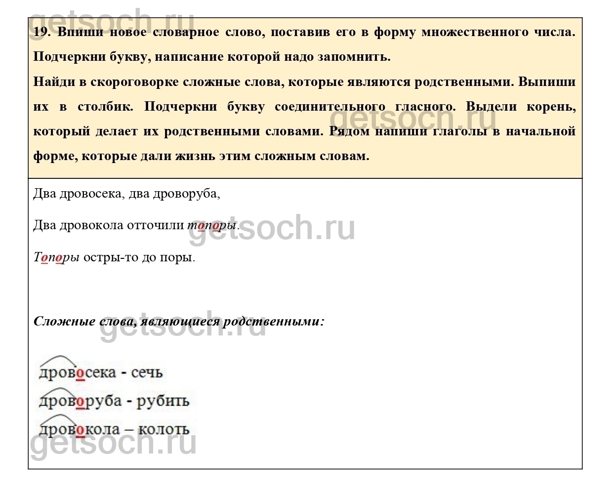 Найди в скороговорке сложные слова, которые являются родственными. Выпиши их в столбик. Подчеркни букву соединительного гласного. Выдели корень, который делает их родственными словами. Рядом напиши глаголы в начальной форме, которые дали жизнь этим сложным словам.
