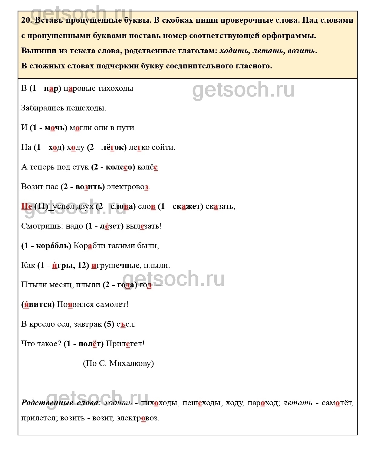 Рассмотрим ответы на Упражнение 20 из тетради для самостоятельной работы по русскому языку для 3 класса Байковой