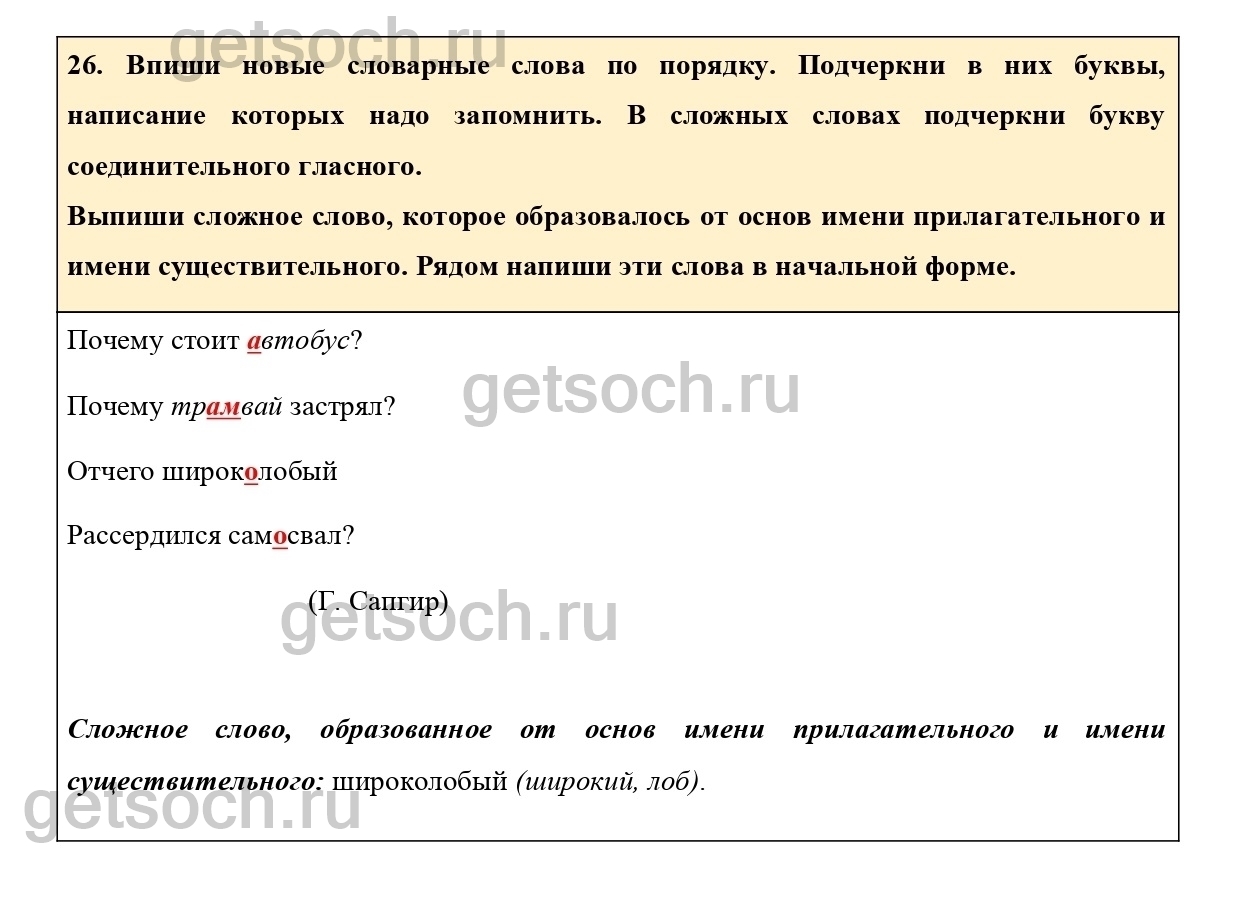 26. Впиши новые словарные слова по порядку. Подчеркни в них буквы, написание которых надо запомнить. В сложных словах подчеркни букву соединительного гласного.