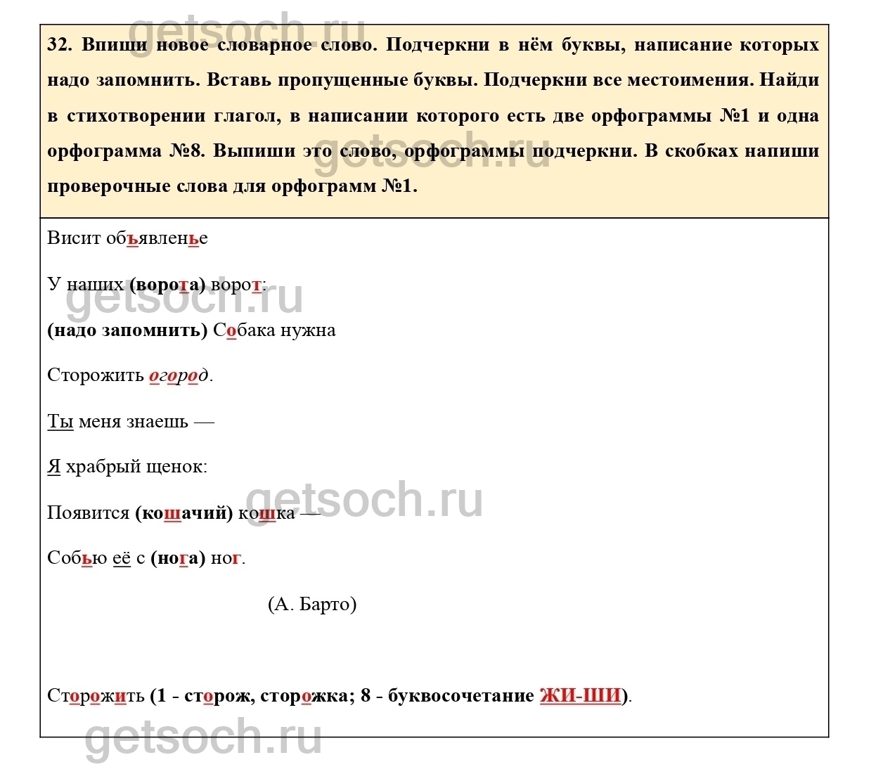 32. Впиши новое словарное слово. Подчеркни в нём буквы, написание которых надо запомнить. Вставь пропущенные буквы. Подчеркни все местоимения. Найди в стихотворении глагол, в написании которого есть две орфограммы №1 и одна орфограмма №8. Выпиши это слово, орфограммы подчеркни. В скобках напиши проверочные слова для орфограмм №1.