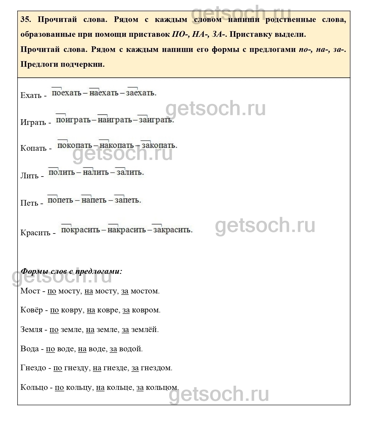 35. Прочитай слова. Рядом с каждым словом напиши родственные слова, образованные при помощи приставок ПО-, НА-, ЗА-. Приставку выдели.