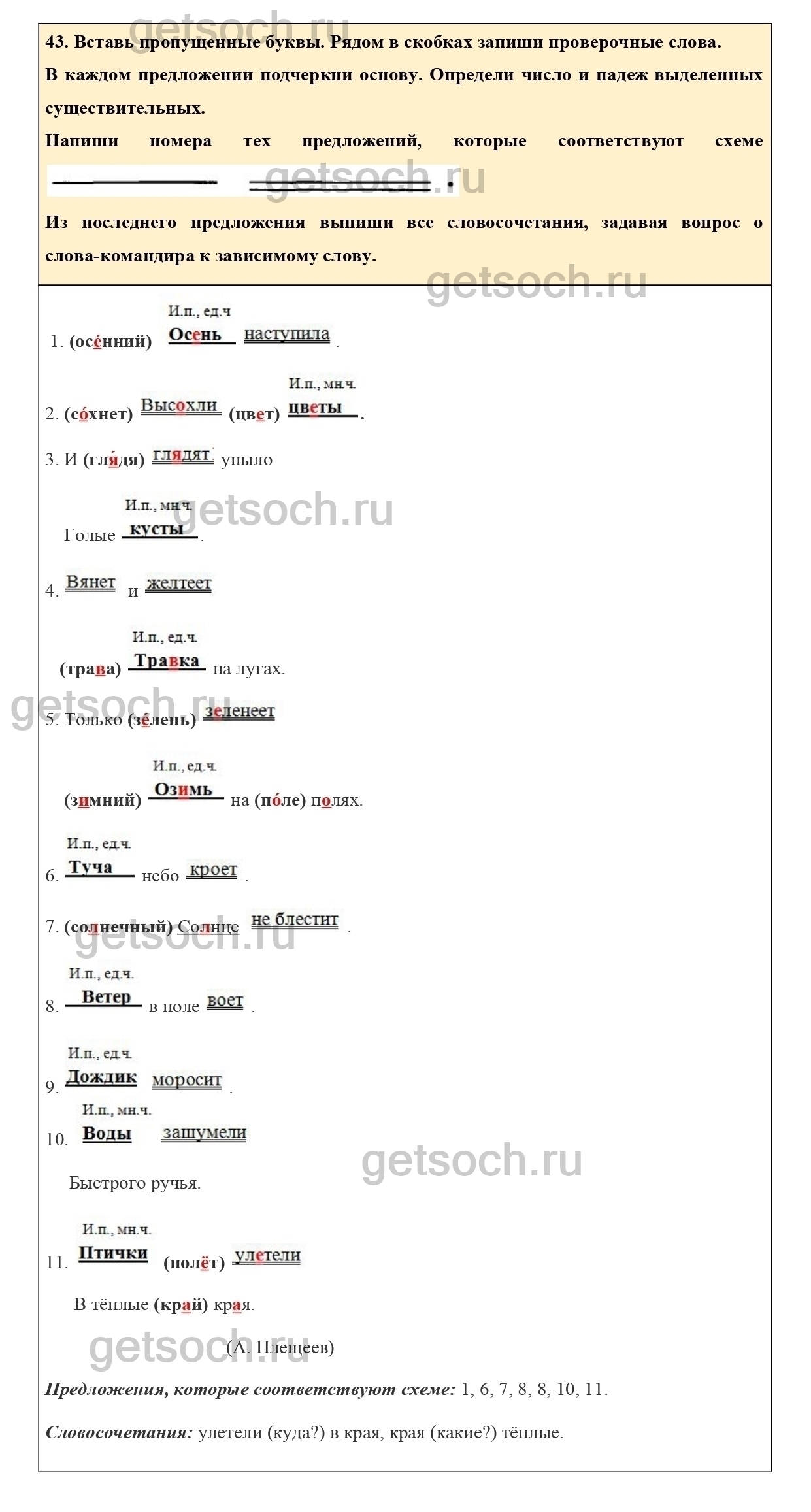 Рассмотрим ответы на Упражнение 43 из тетради для самостоятельной работы по русскому языку для 3 класса Байковой