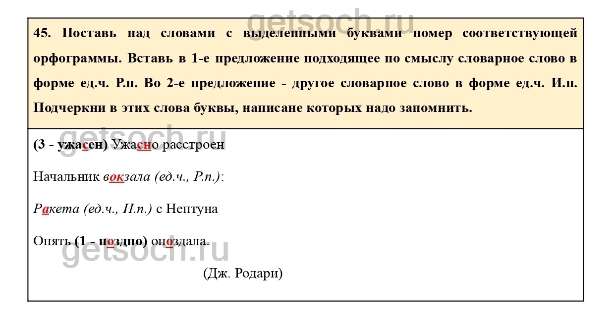 45. Поставь над словами с выделенными буквами номер соответствующей орфограммы. Вставь в 1-е предложение подходящее по смыслу словарное слово в форме ед.ч. Р.п. Во 2-е предложение – другое словарное слово в форме ед.ч. И.п. Подчеркни в этих слова буквы, написане которых надо запомнить.