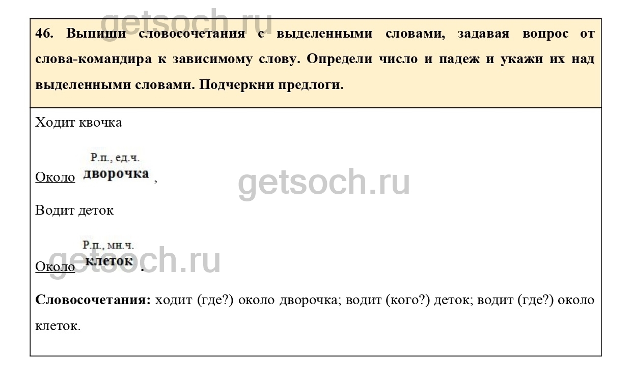 46. Выпиши словосочетания с выделенными словами, задавая вопрос от слова-командира к зависимому слову. Определи число и падеж и укажи их над выделенными словами. Подчеркни предлоги.