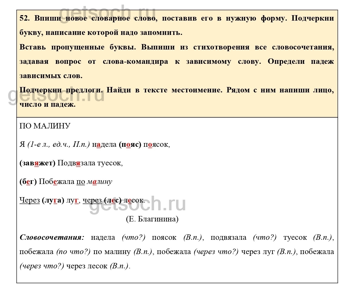 Рассмотрим ответы на Упражнение 52 из тетради для самостоятельной работы по русскому языку для 3 класса Байковой