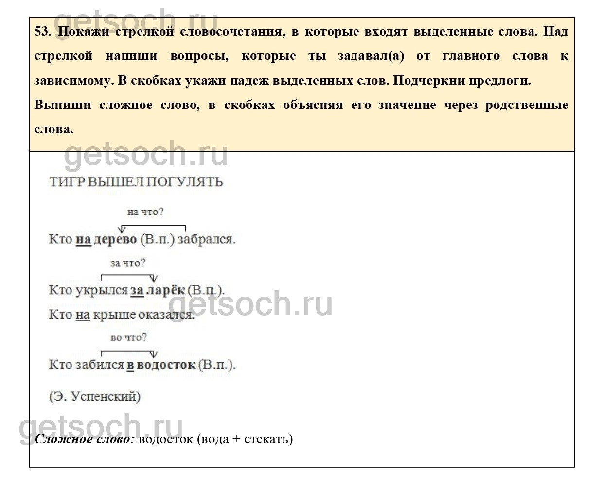 53. Покажи стрелкой словосочетания, в которые входят выделенные слова. Над стрелкой напиши вопросы, которые ты задавал(а) от главного слова к зависимому. В скобках укажи падеж выделенных слов. Подчеркни предлоги.