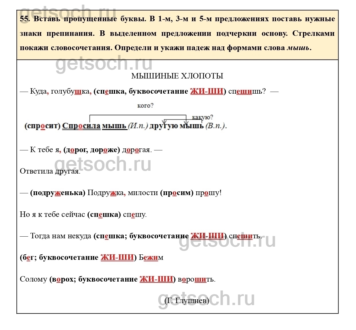 55. Вставь пропущенные буквы. В 1-м, 3-м и 5-м предложениях поставь нужные знаки препинания. В выделенном предложении подчеркни основу. Стрелками покажи словосочетания. Определи и укажи падеж над формами слова мышь.