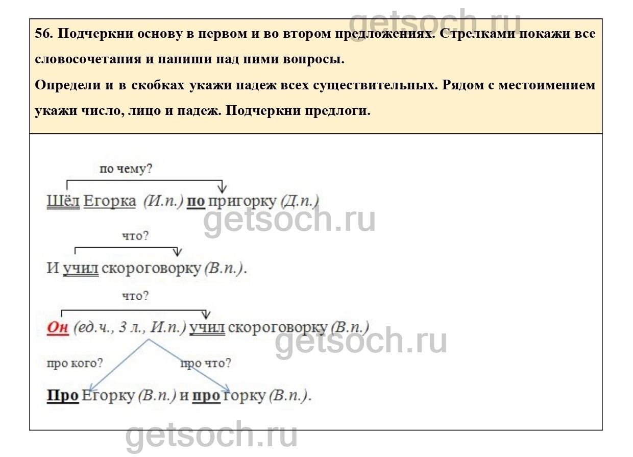 56. Подчеркни основу в первом и во втором предложениях. Стрелками покажи все словосочетания и напиши над ними вопросы.