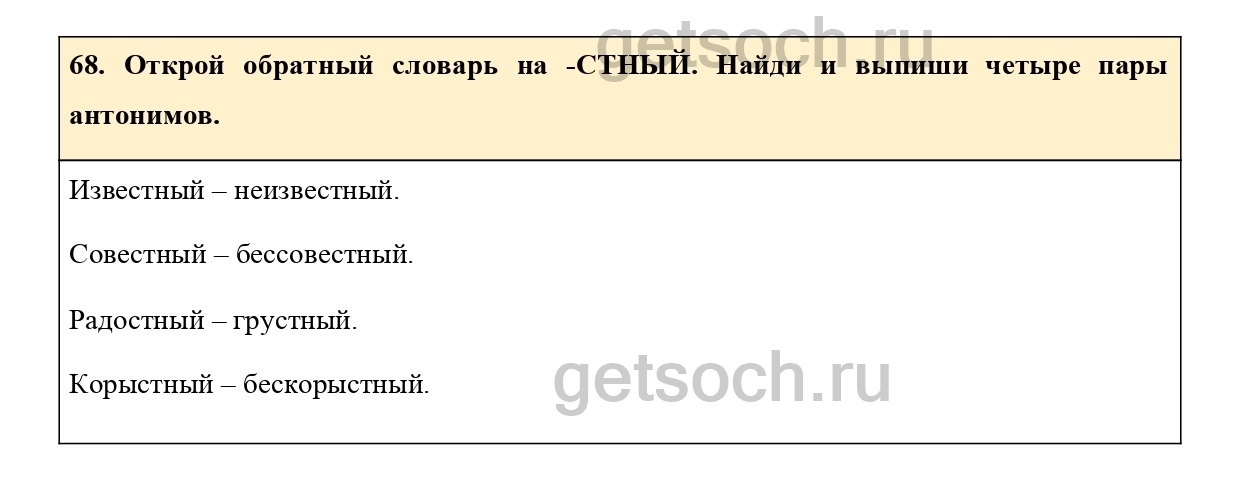 68. Открой обратный словарь на -СТНЫЙ. Найди и выпиши четыре пары антонимов.