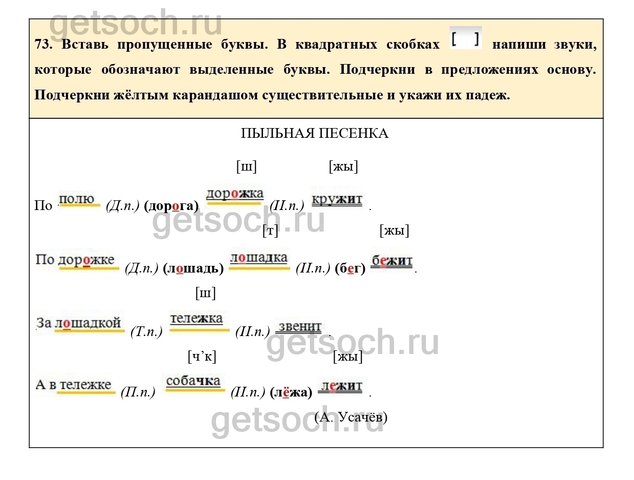 73. Вставь пропущенные буквы. В квадратных скобках напиши звуки, которые обозначают выделенные буквы. Подчеркни в предложениях основу. Подчеркни жёлтым карандашом существительные и укажи их падеж.