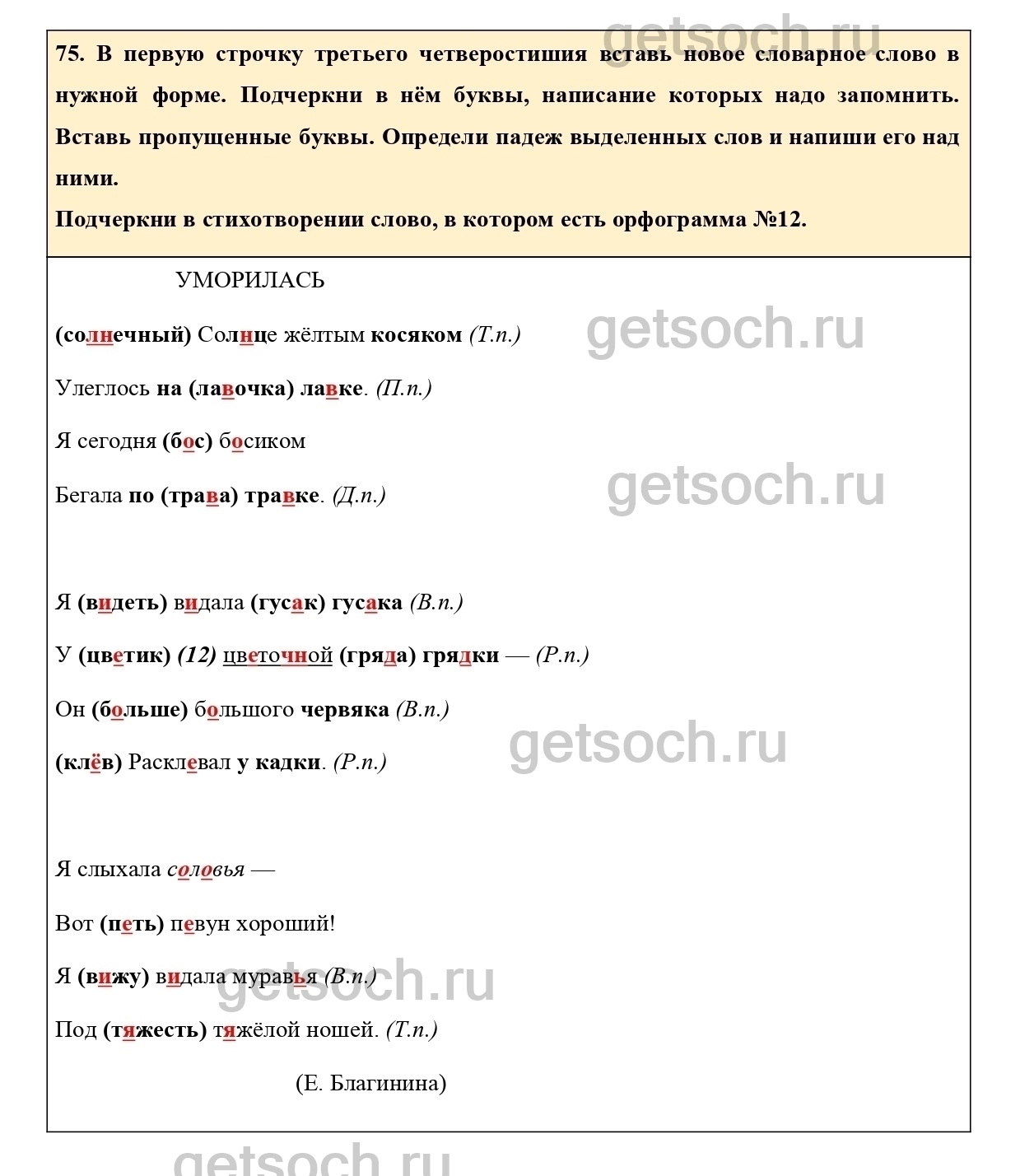 75. В первую строчку третьего четверостишия вставь новое словарное слово в нужной форме. Подчеркни в нём буквы, написание которых надо запомнить. Вставь пропущенные буквы. Определи падеж выделенных слов и напиши его над ними.