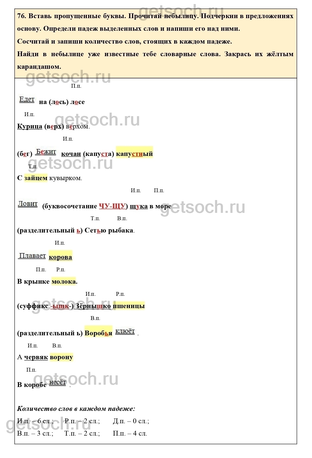 76. Вставь пропущенные буквы. Прочитай небылицу. Подчеркни в предложениях основу. Определи падеж выделенных слов и напиши его над ними.