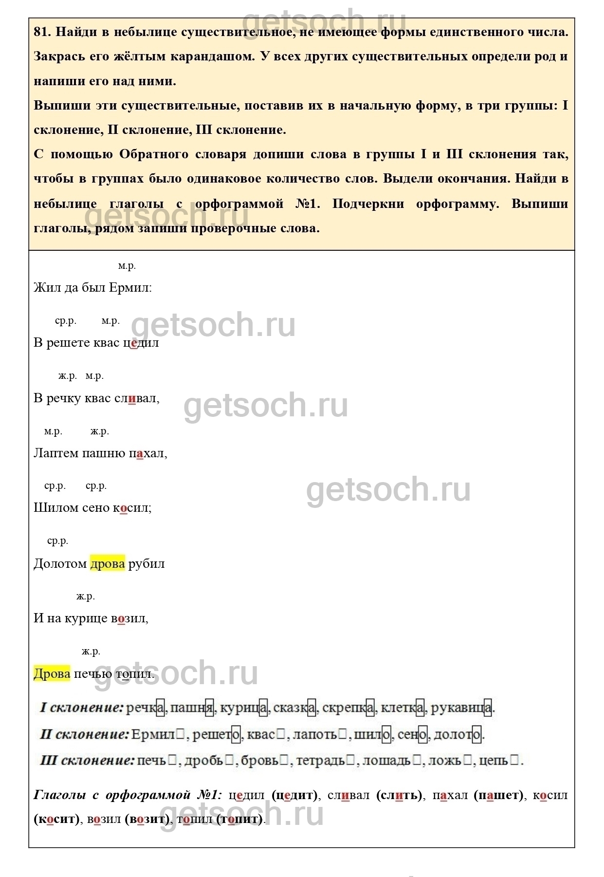 81. Найди в небылице существительное, не имеющее формы единственного числа. Закрась его жёлтым карандашом. У всех других существительных определи род и напиши его над ними.