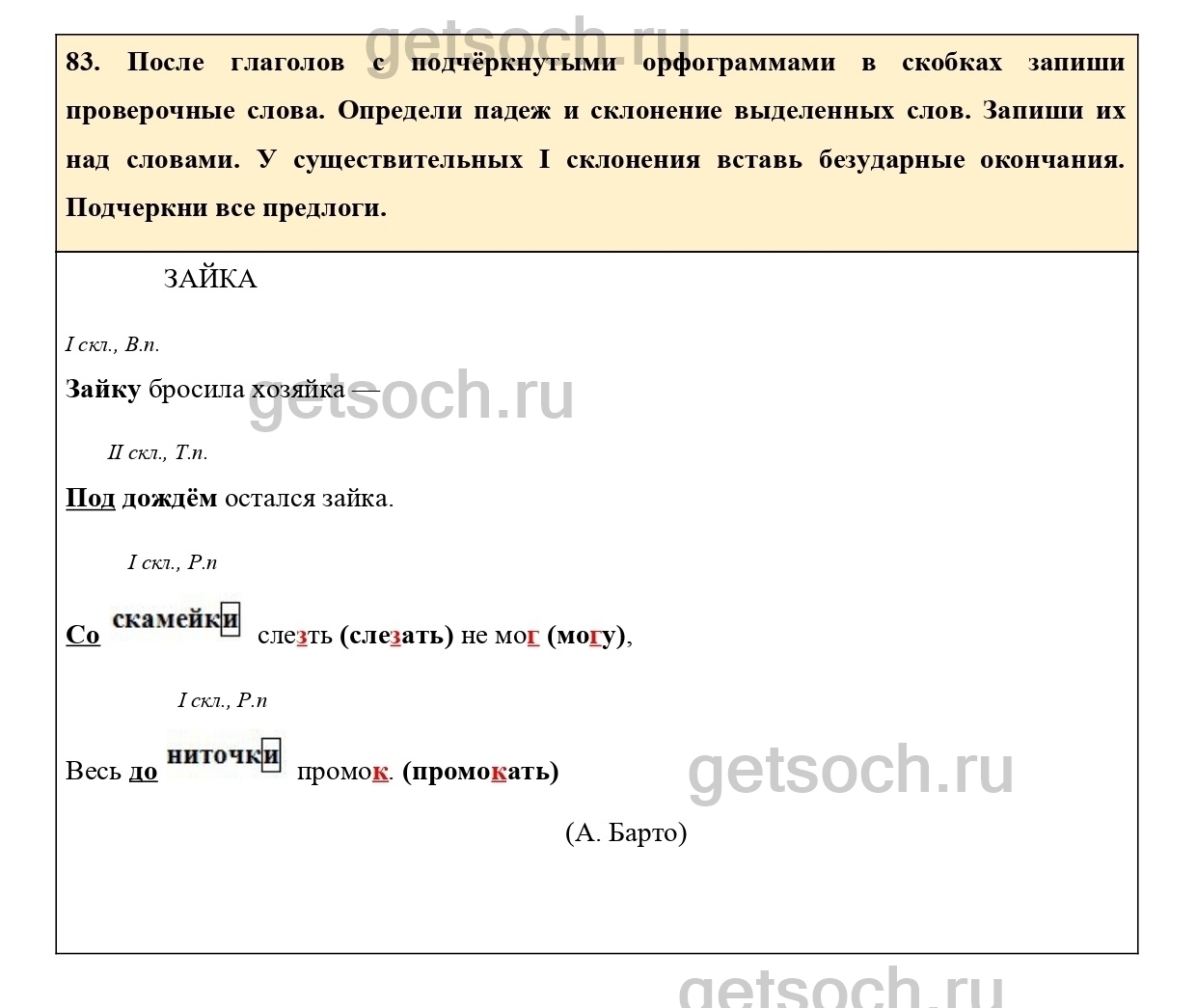 83. После глаголов с подчёркнутыми орфограммами в скобках запиши проверочные слова. Определи падеж и склонение выделенных слов. Запиши их над словами. У существительных I склонения вставь безударные окончания. Подчеркни все предлоги.