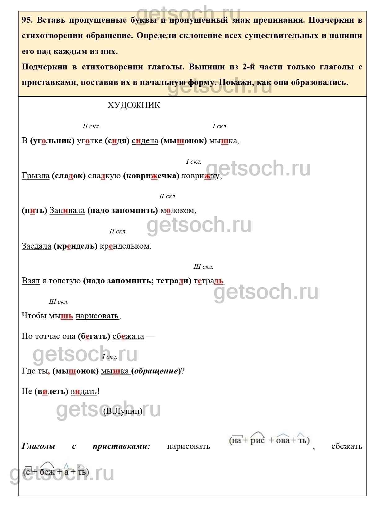 95. Вставь пропущенные буквы и пропущенный знак препинания. Подчеркни в стихотворении обращение. Определи склонение всех существительных и напиши его над каждым из них.