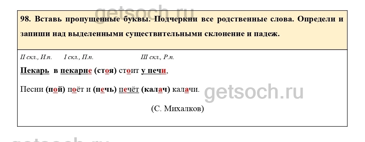 98. Вставь пропущенные буквы. Подчеркни все родственные слова. Определи и запиши над выделенными существительными склонение и падеж.