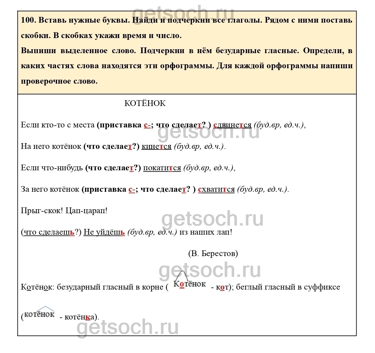 Рассмотрим ответы на Упражнение 100 из тетради для самостоятельной работы по русскому языку для 3 класса Байковой