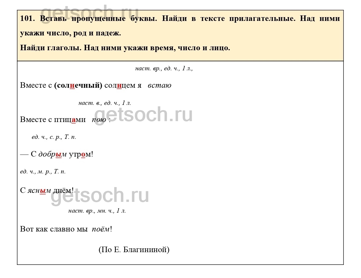 101. Вставь пропущенные буквы. Найди в тексте прилагательные. Над ними укажи число, род и падеж.