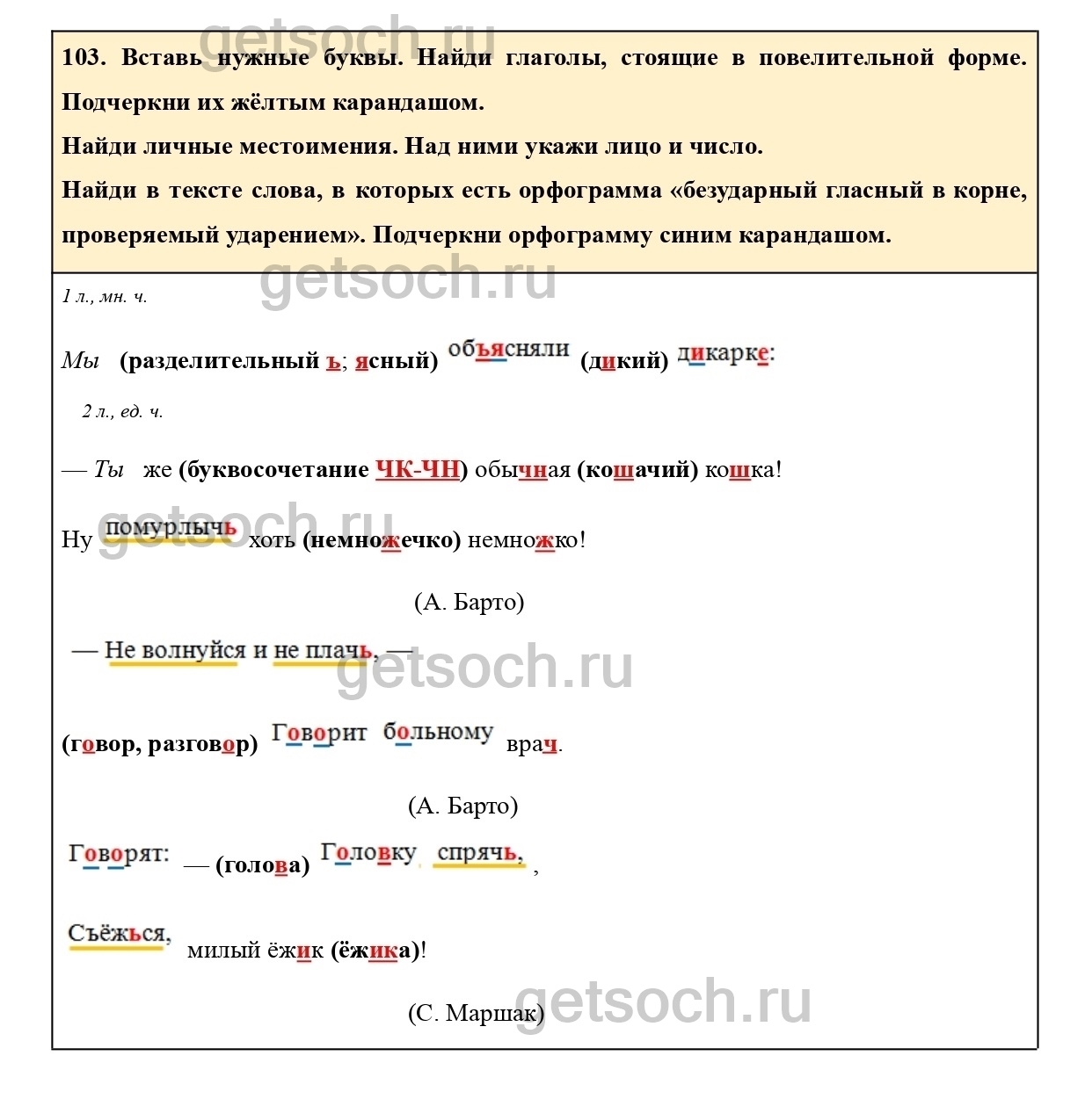 103. Вставь нужные буквы. Найди глаголы, стоящие в повелительной форме. Подчеркни их жёлтым карандашом.