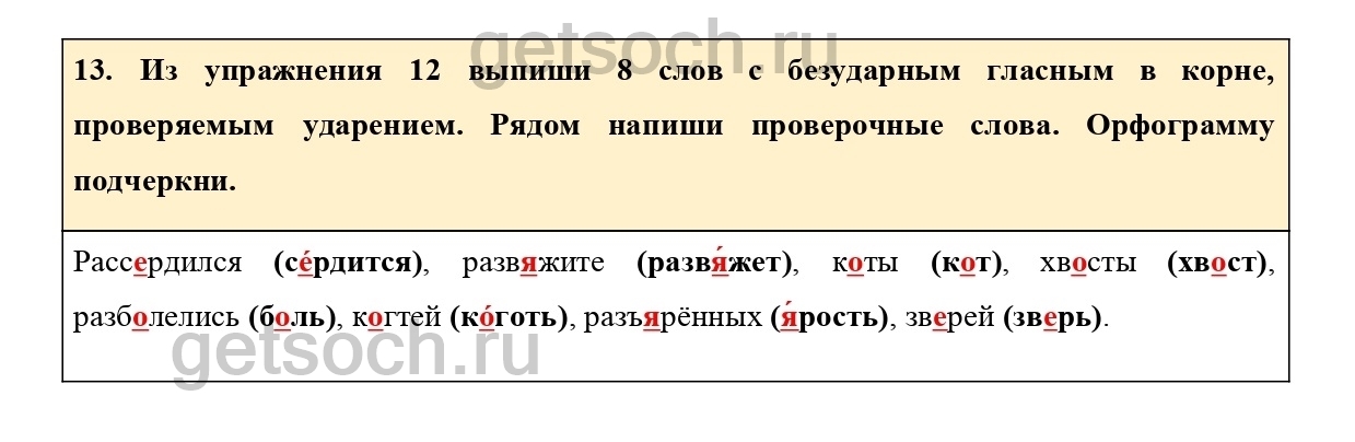 13. Из упражнения 12 выпиши 8 слов с безударным гласным в корне, проверяемым ударением. Рядом напиши проверочные слова. Орфограмму подчеркни.