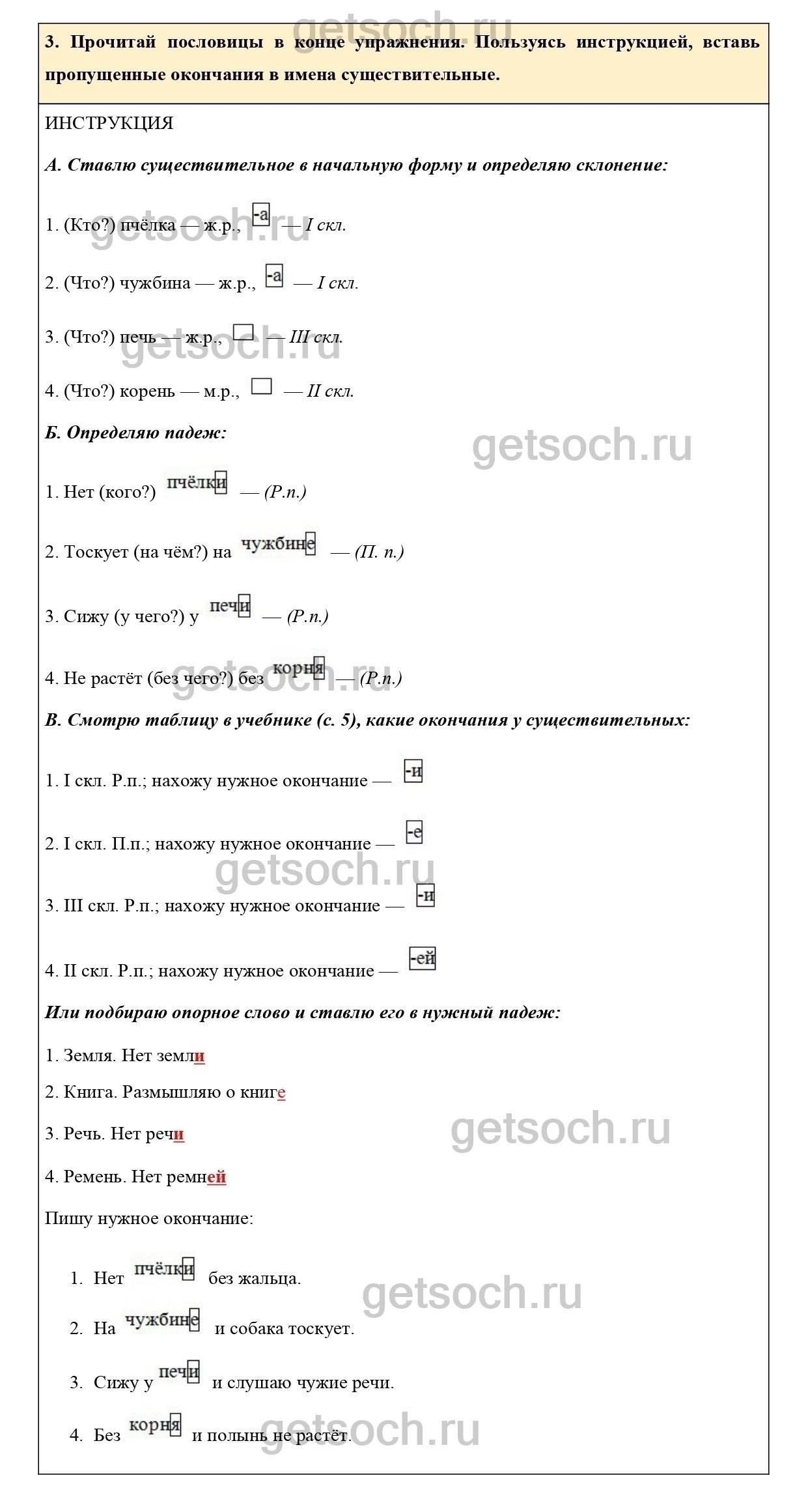3. Прочитай пословицы в конце упражнения. Пользуясь инструкцией, вставь пропущенные окончания в имена существительные.