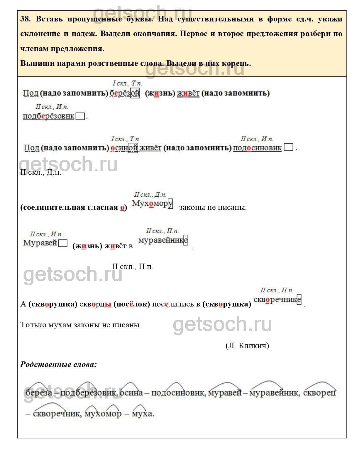 38. Вставь пропущенные буквы. Над существительными в форме ед.ч. укажи склонение и падеж. Выдели окончания. Первое и второе предложения разбери по членам предложения.