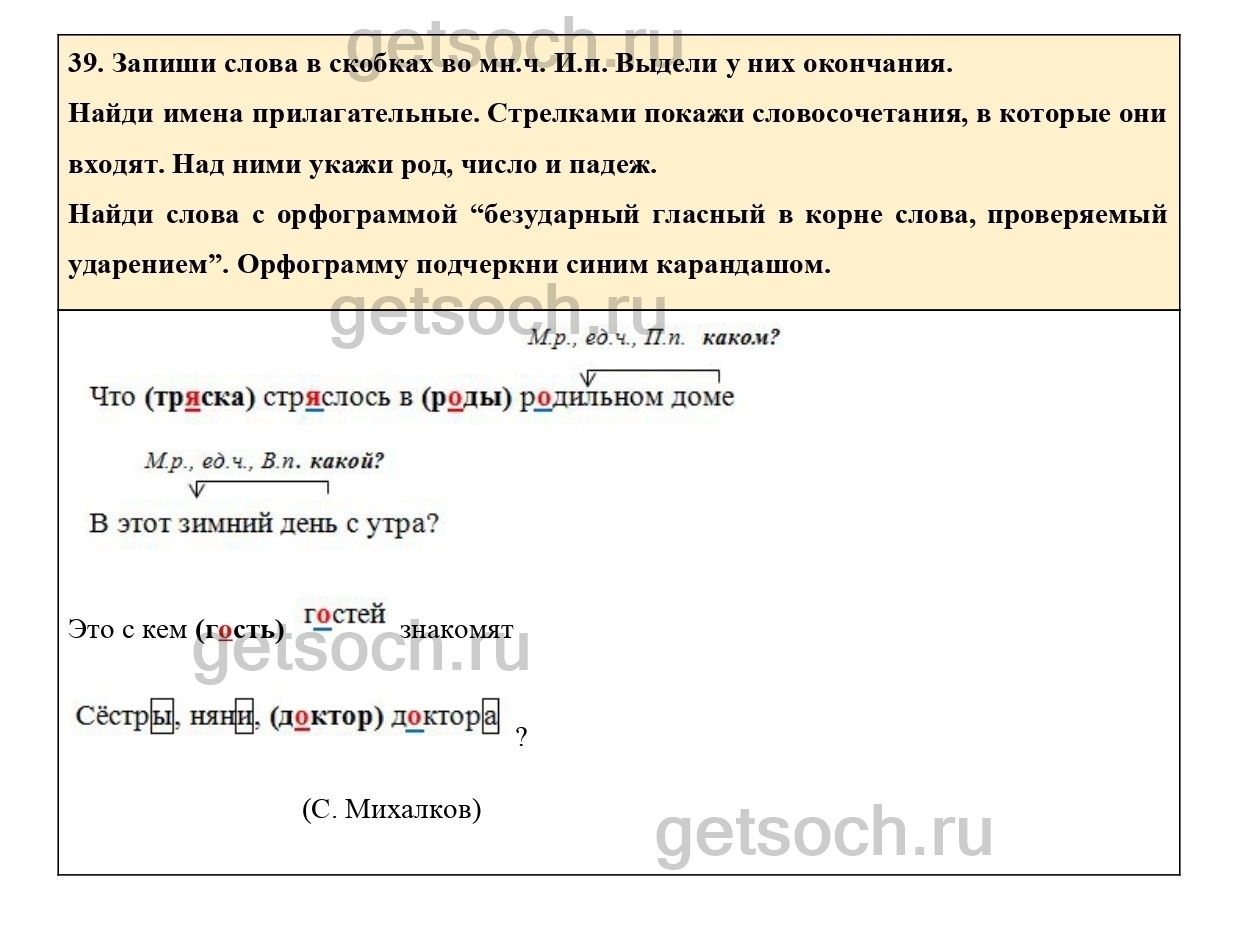 Рассмотрим ответы на Упражнение 39 из тетради для самостоятельной работы по русскому языку для 3 класса Байковой
