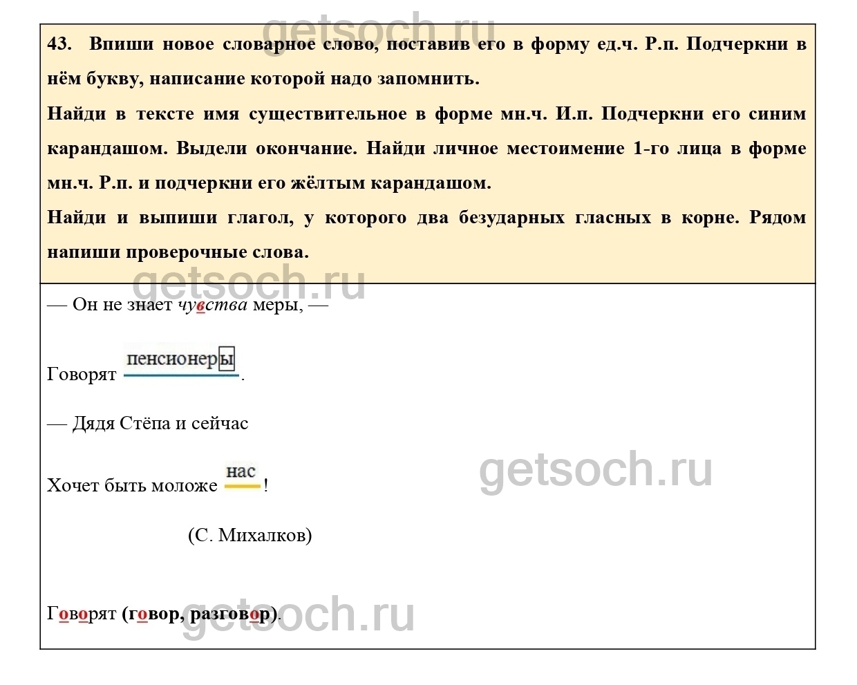Рассмотрим ответы на Упражнение 43 из тетради для самостоятельной работы по русскому языку для 3 класса Байковой